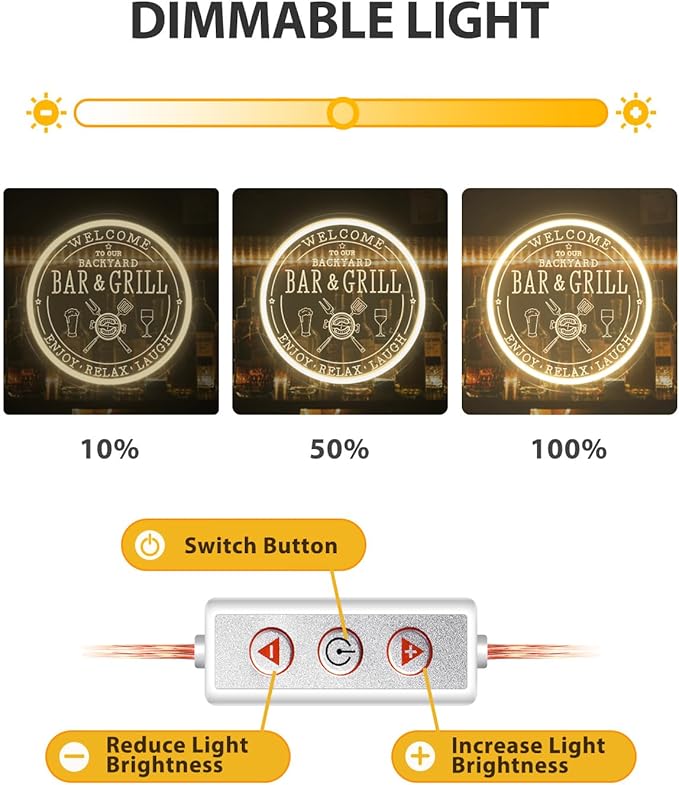 - ✨【10-Level Dimmable】Customize your bar grill signs experience with our 10-level dimmable feature! Adjust the brightness of your neon sign to match your mood or ambiance. Whether you want a subtle glow or a bright, vibrant display, you can easily adjust it to your preference with our easy-to-use dimming controls.