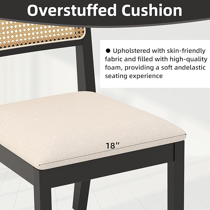 Westice Rattan Dining Chairs Set of 4, Farmhouse Natural Dining Room Chairs with Upholstered Cushion, Wood Armless Chairs for Kitchen/Restaurant, Black