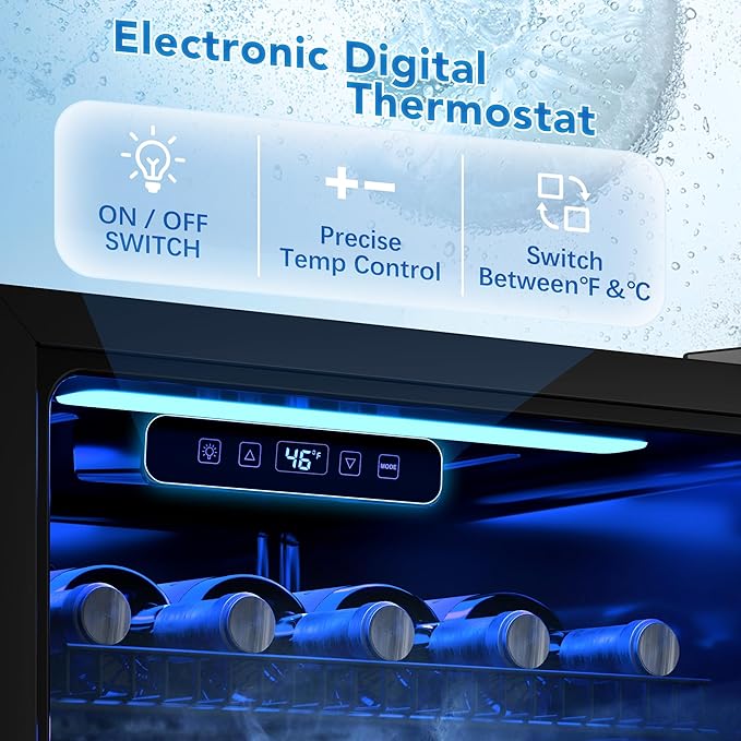 - [Simple & Intelligent Control System] Our Beverage Refrigerator features a user-friendly touch panel that allows for easy temperature adjustment. With a temperature range of 35-65Β°F (2-18Β°C), you can easily customize the temperature to your liking (55Β°F is often cited as close to perfect). To accommodate your usage preferences, we have also added a MODE button. This allows you to toggle between Fahrenheit and Celsius temperatures.There's also an LED light that comes on at the touch of a button.