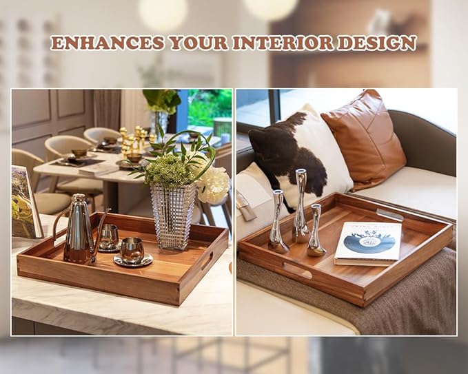 - 【LARGE SQUARED OTTOMAN TRAY】This wooden serving tray with handles made from a sturdy acacia wood, durable, wipeable, food-safety, beautiful and functional. The big tray for ottoman coffee table is a good addition to your home.