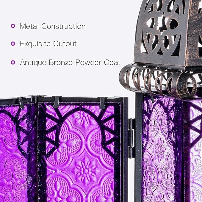 - STURDY BUILD - Crafted of metal, this lantern decorative outdoor has a rustic antique copper finish with handpainted accents and glass panels, metal top and ring. Stained glass panes, greatly reduce the damage of glass when decorative lanterns from external changes. It will hold your candles up to 3.5" dia. Measures 4.5"Wx11"H. Great choice as a gift for your loved ones to!