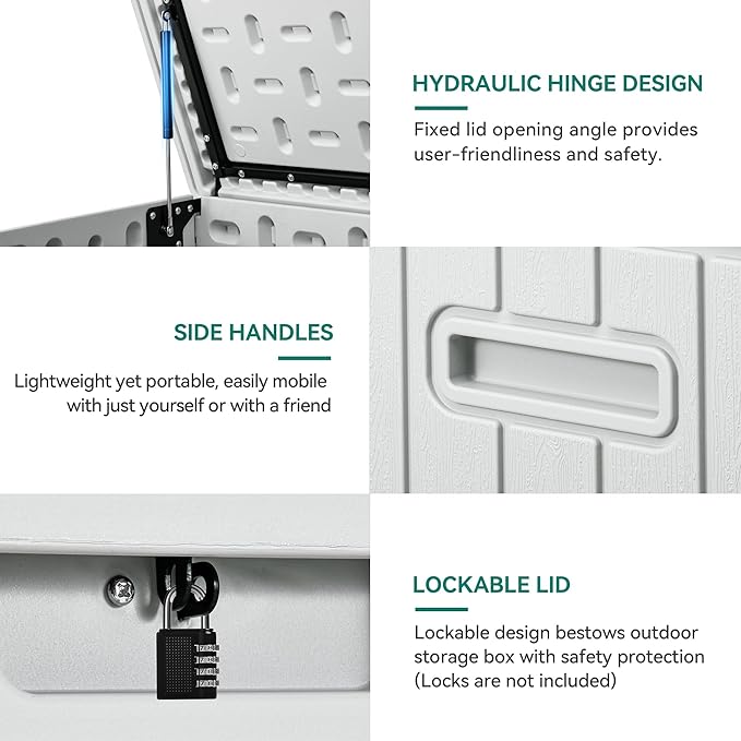 - XXL DECK STORAGE BOX:Boasts generous 260 gal capacity with outer dimensions of 69.69''L x 32.28''W x 32.68''H; Stands out as a top pick for both indoor and outdoor settings with easy-lift system