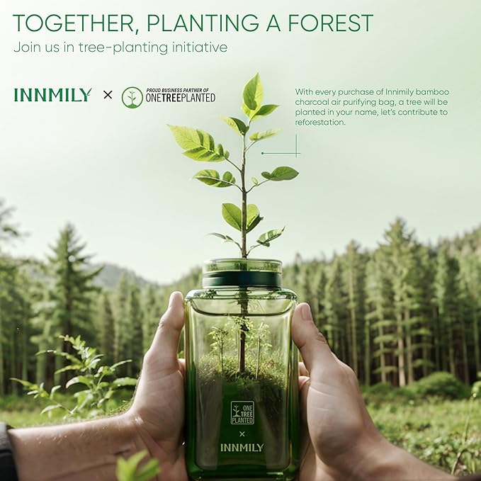- TOGETHER, PLANTING A FOREST - We invite you to join us in tree-planting initiative - every purchase of Innimily bamboo charcoal air purifying bag, a tree will be planted in your name, let’s contribute to reforestation, aligning your well-being with environmental responsibility. natural solution that not only captures odors but also contributes to sustainability. Innmily home deodorizer bring fresh air, we offer no question asked money-back if you were not satisfied with the smoke absorber