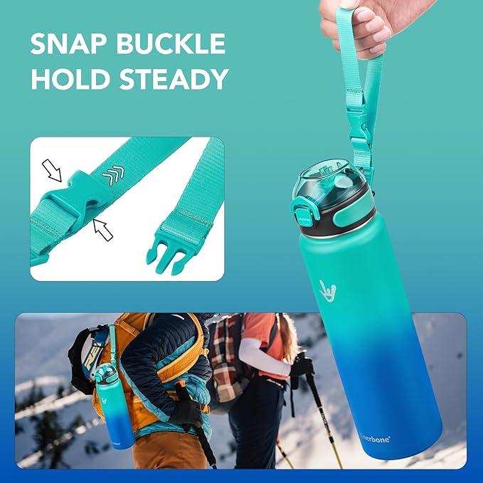 - Easy Travel: With its generous 32 oz capacity, the water bottle with snap buckle is perfect for all your outdoor adventures, such as hiking, camping, and sporting events. Stay hydrated and enjoy your journey hassle-free with this versatile companion.