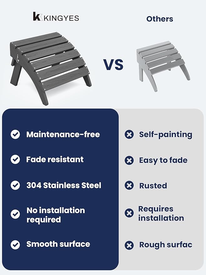 - [Low Maintenance]: Enjoy the hassle-free ownership of the KINGYES Adirondack Foot Rest. Its HDPE material requires no painting, staining, or waterproofing, making it the ultimate low-maintenance outdoor accessory.