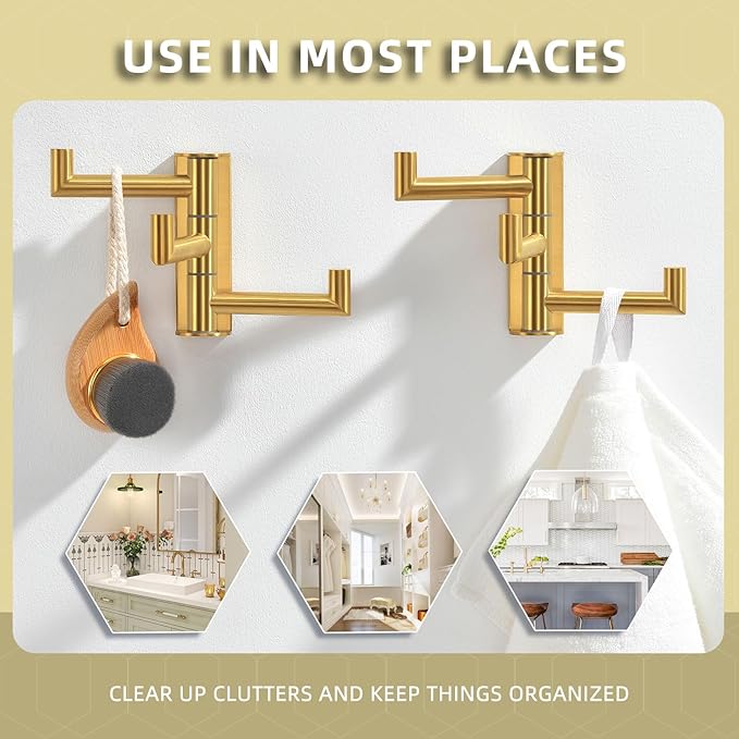 Angle Simple Towel Hooks Swivel, SUS 304 Stainless Steel 3 Arms Foldable Hand Towel Holder, Coat Hooks, Brushed Gold, 2 Pack