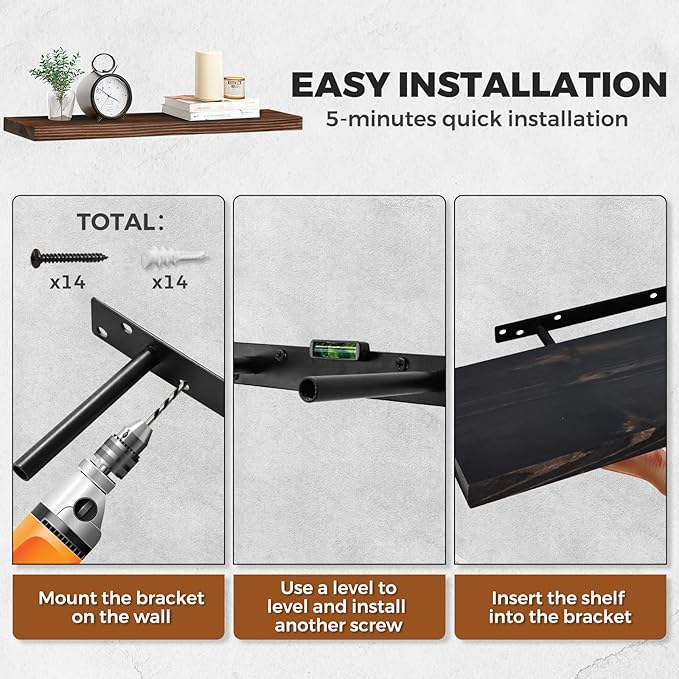 - Stable Floating Brackets: The shelves include hidden steel brackets for secure and wobble-free support. This clean floating look seamlessly blends into any room, whether it’s the living room, kitchen, or office