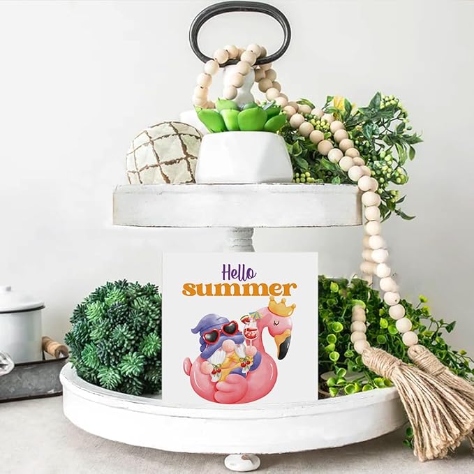 Hello Summer Decor Flamingo Decorations Summer Gnome Wooden Sign Rustic Home Decor 5 x 5 Inches