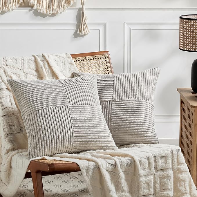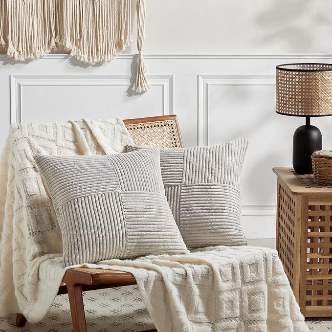 Fancy Homi 2 Packs Neutral Grey Big Decorative Throw Pillow Covers 24x24 Inch for Living Room Couch Bed, Rustic Farmhouse Boho Home Decor, Soft Corss Corduroy Patchwork Accent Square Cushion Case 60cm
