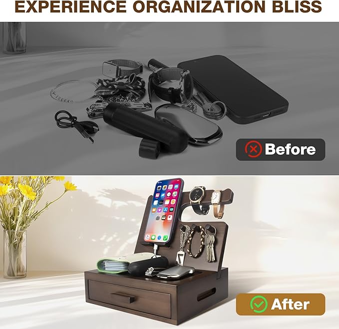 - Multifunctional Charging Station & Organizer: Perfect solution for staying organized while charging your phone. With a compact size, this charging station fits easily on your desk, nightstand, or any other tabletop surface. It is designed to hold your phone while it charges, as well as provide convenient storage for your daily essentials.