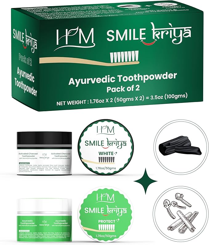 HM - Smile Kriya Ayurvedic Toothpowder Duo (Pack of 2) | Whitens Teeth Naturally, Remineralizes Enamel, Strengthens Gums & Freshens Breath | Activated Charcoal & NanoHydroxyapatite | 1.76 oz X 2