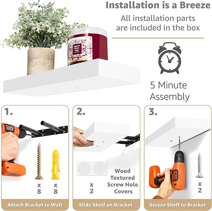 - Easy Installation: Mounting hardware INCLUDED. Hanging shelves are made of beautiful MDF with PVC + bracket. Attaches firmly to the wall. Minor assembly is required. Supports up to 22 pounds per shelf. Measures approximately 16.25 in L x 5.50 in W. Each display shelf 1.5 in thick