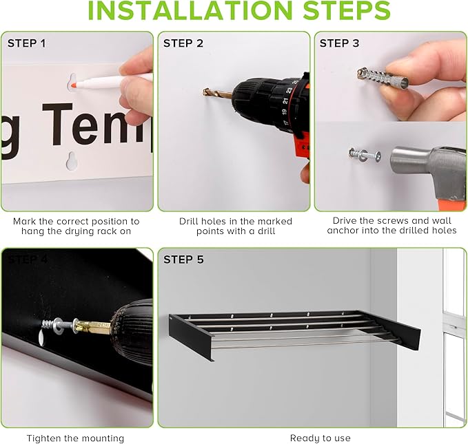 - Laundry drying rack includes an installation manual, accessories bag, and borehole locator paperboard for easy setup. In just minutes, you'll have a functional and dependable collapsible clothes drying rack.