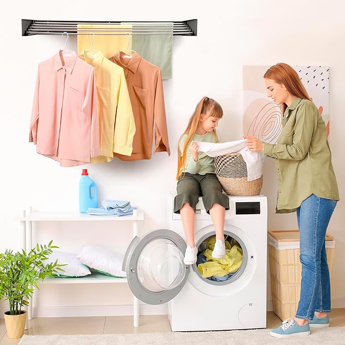 - Collapsible laundry drying rack is the ideal space-saving solution. Wall-mounted and foldable, it neatly tucks away when not in use, freeing up valuable floor space
