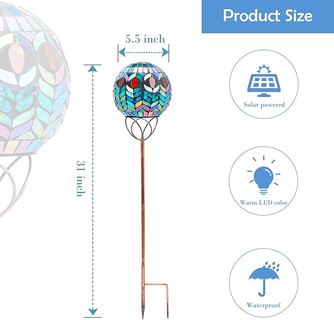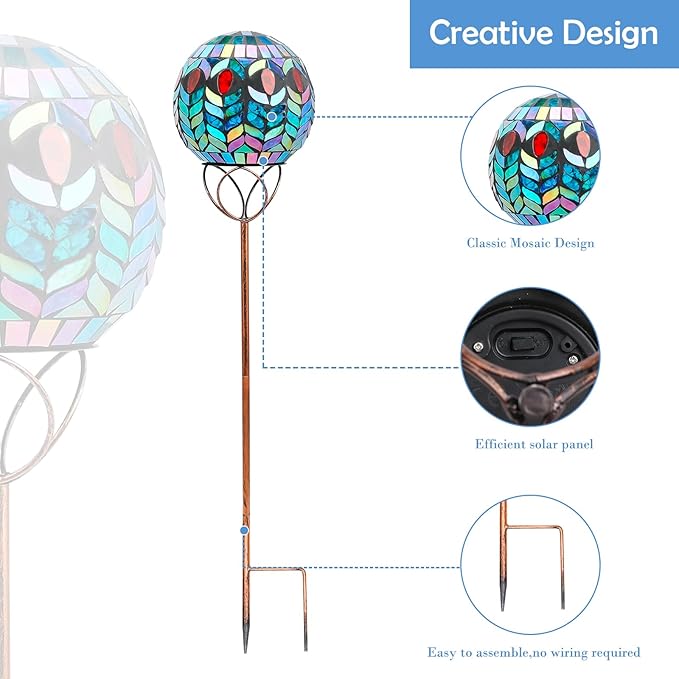 - Unique design: Solar mosaic stake adds fun to your garden, patio or pathway. Artistry mosaic ball can reflect light via crackle-like glass from every angle under the sun