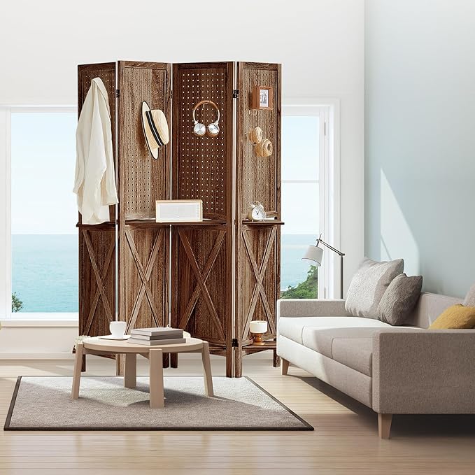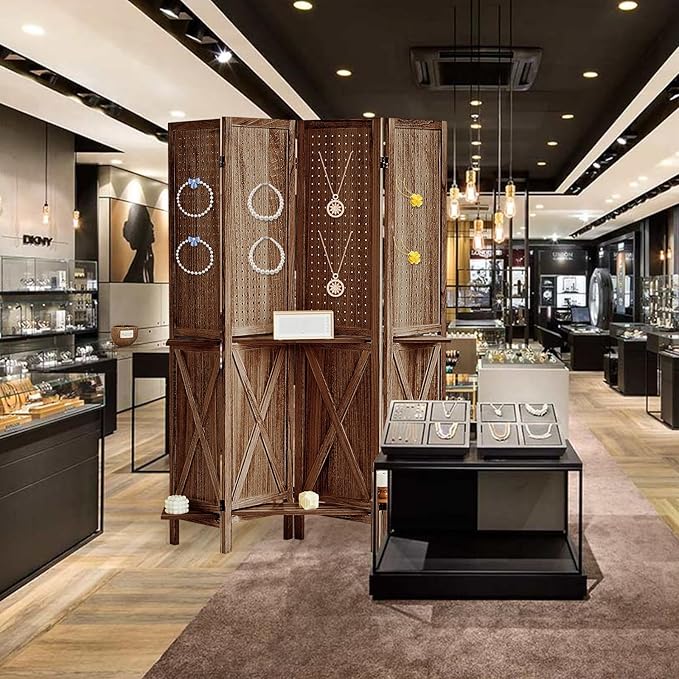 4 Panel Pegboard Display with 16 Hooks, Wooden Pegboard Room Divider Wall with Shelf, Rustic Room Dividers and Folding Privacy Screens, Bedroom, Jewelry Store, Brown
