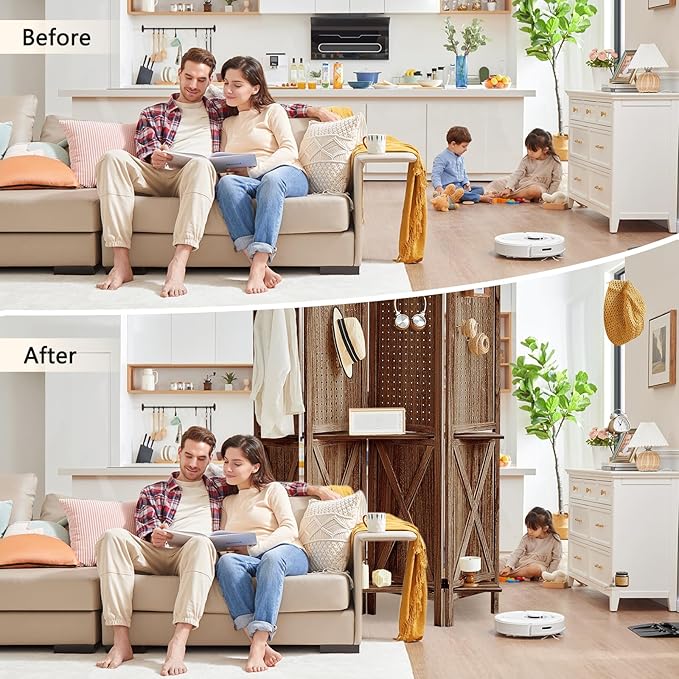 - Double Shelves Design - The exquisite double shelf design, skillfully integrated into the room divider, not only enhances the sense of hierarchy of the space, but also gives it practicality. The upper level can display your favorite artwork, photos or books, while the lower level can be used for plants, small ornaments or daily necessities, denying space clutter. Pegboard room divider design takes into account both display and storage needs, making your living space both beautiful and organized