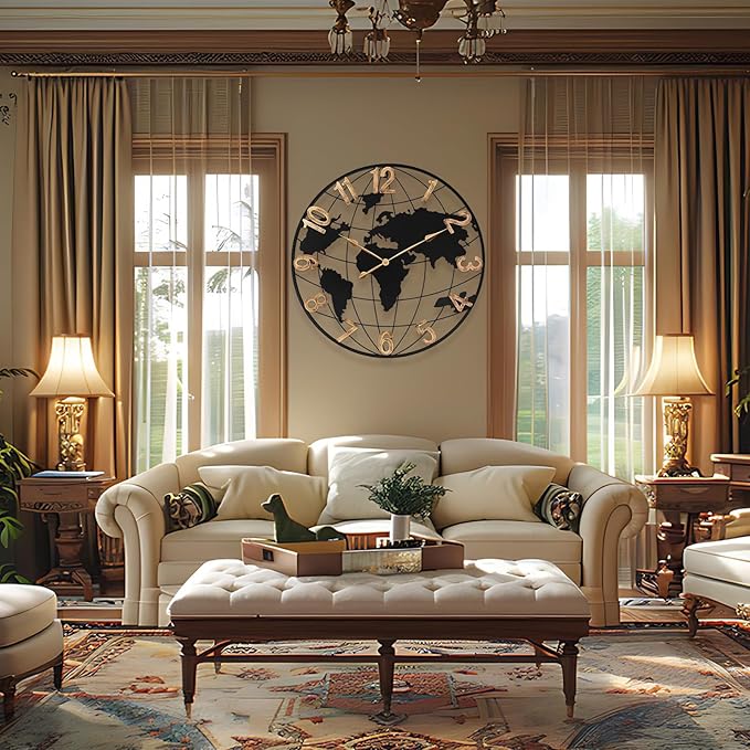 - 【Ideal Wall Decoration】The large metal farmhouse world map wall clock definitely draws attention on the wall and stands out:If you wanted to get a more big modern decorative wall clock for the new style decor,It's a wonderful addition to your living room fireplace,kitchen, dining room, bedroom, above your TV or anywhere: People stop to watch the industrial world map clock and comment on the clocks novelty.