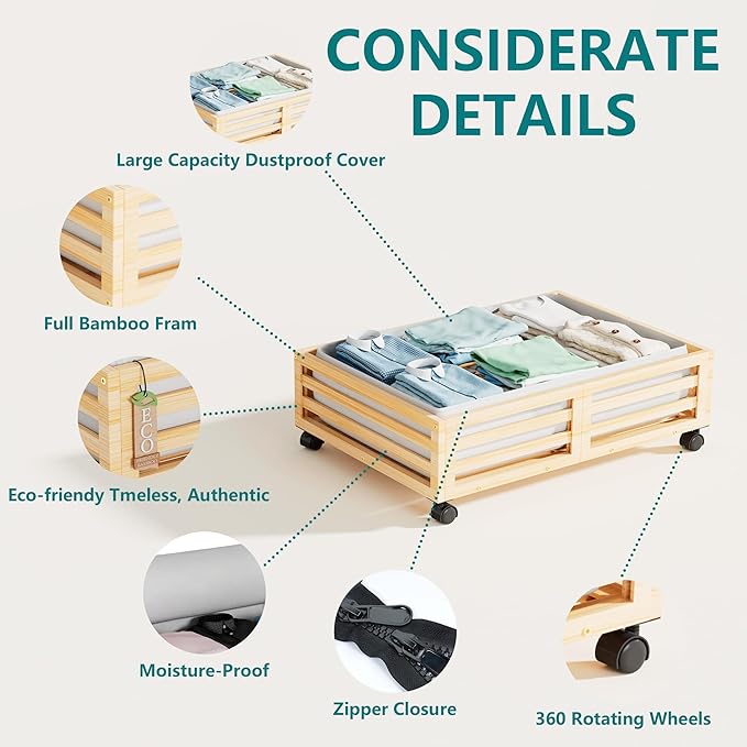 - π[Sturdy and Durable] Our under bed storage with wheels is crafted from premium wood bamboo, boasting 4 rotating wheels and a capacity of 120lbs. This 'under bed storage' solution includes non-woven bags for efficient organization of clothes, books, shoes, and toys.