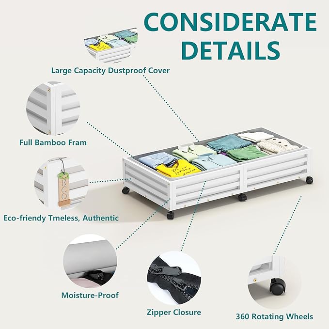 - π[Sturdy and Durable] Our under bed storage with wheels is crafted from premium wood bamboo, boasting 4 rotating wheels and a capacity of 120lbs. This 'under bed storage' solution includes non-woven bags for efficient organization of clothes, books, shoes, and toys.