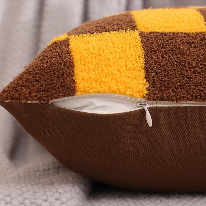 Alysheer Checkered Embroidered Decorative Throw Pillow Covers 18"x 18" Set of 2, Farmhouse Maillard Orange Brown Plaid Tufted Patterned Cotton Canvas Cushion Case for Sofa Couch Bed Living Room
