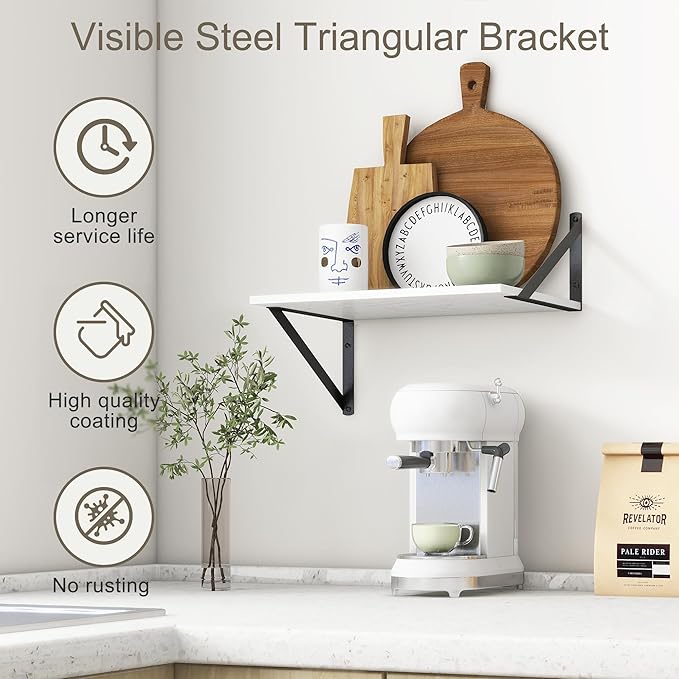 - 【FARMHOUSE RUSTIC WALL SHELF】These floating shelves are made of premium engineered wood board and visible triangular bracket. The rustic wooden grain surface add character and warmth to any modern or traditional interior with these deep floating shelves, contrast shelves at staggering heights on the wall or mount side-by-side or in the corner for a clean streamlined look.