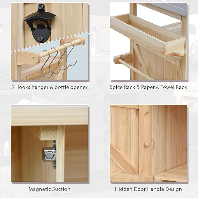 Outdoor Grill Table with Stainless Steel Top, Farmhouse Solid Wood Kitchen Island Cart with Internal Storage Rack, Outdoor Bar Cart with Storage Cabinet, Spice & Towel Rack, Natural