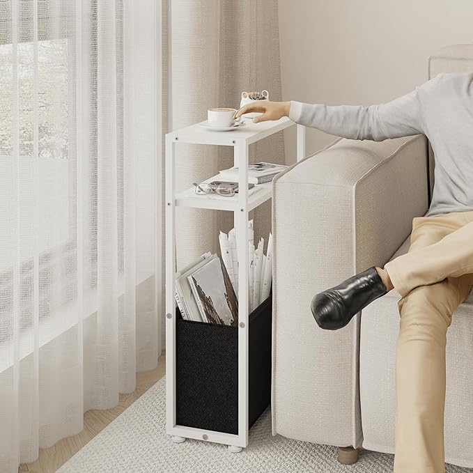 Narrow Side Table, Slim End Tables with Fabric Basket, Skinny Table for Small Spaces, Thin Bedside Table for Living Room, Bedroom, White, ZBZ01