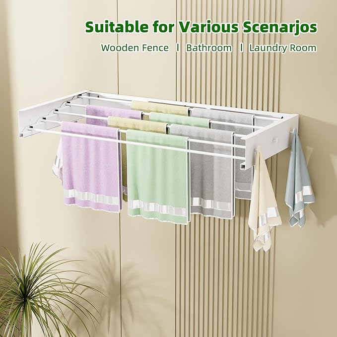 - Upgrade Drying Racks & Space Saver: 6 convenient Knob Hooks attached on wall mounted drying racks make it easy to retract, allowing you to hang clothes, towels, ties or extra stuff even when folded. Upgrade smoothness and quietness when retracting and opening. Upgrade the stability of poles, so the rods on it never spin with wet laundry loaded. laundry drying rack folds flat against the wall, really save space when not in use.