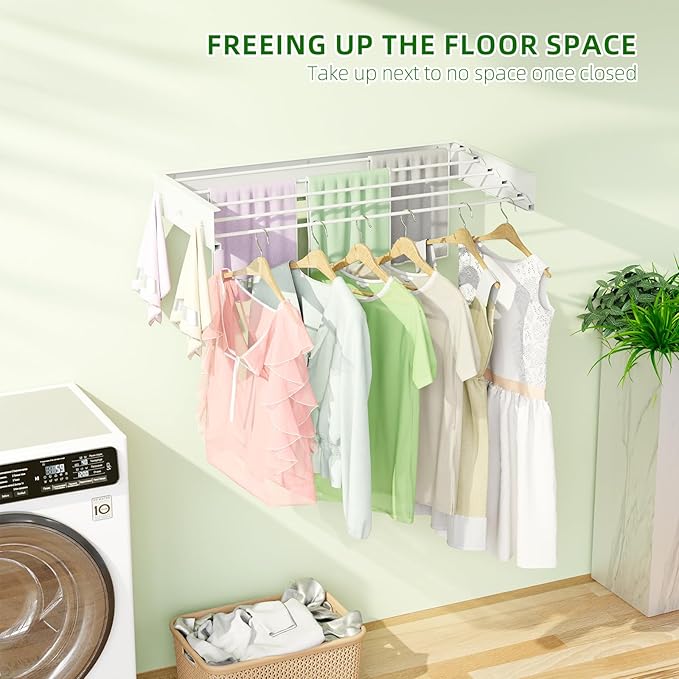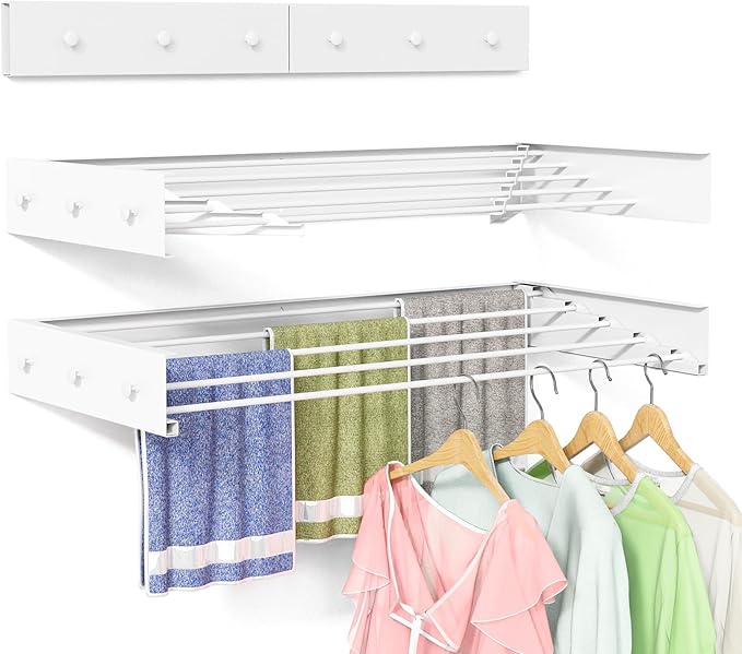 - Upgrade Drying Racks & Space Saver: 6 convenient Knob Hooks attached on wall mounted drying racks make it easy to retract, allowing you to hang clothes, towels, ties or extra stuff even when folded. Upgrade smoothness and quietness when retracting and opening. Upgrade the stability of poles, so the rods on it never spin with wet laundry loaded. laundry drying rack folds flat against the wall, really save space when not in use.