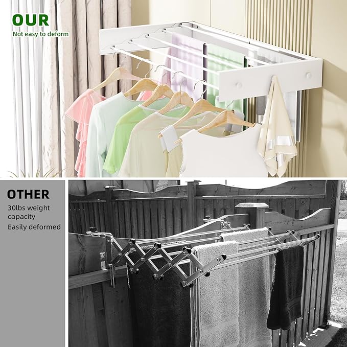 - Strong Load Bearing Capacity: Solid structure, high-quality material, rust-proof and wear-resistant. Folding clothes drying rack wall mounted, 5 heavy aluminum rods, and supports up to 60 lbs. Whether it’s towels, sweaters, clothing. providing a stability and reliable solution for laundry room, kitchen, or utility spaces.