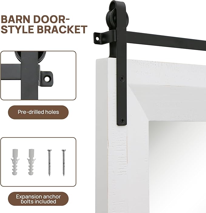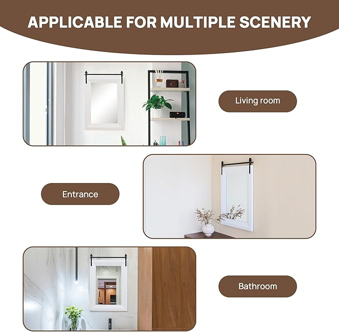 - 【Premium Solid Wood Frame】The frame of the farmhouse mirror is made of premium fir wood with oil-based paint to prevent scratches and ensure durability and resistance to moisture. The solid wood frame gives the rustic mirror a sturdy and authentic look, adding a touch of farmhouse appeal to the bathroom, living room, powder room, entryway, hallways, bedroom, dressing room, garden, courtyard, etc.