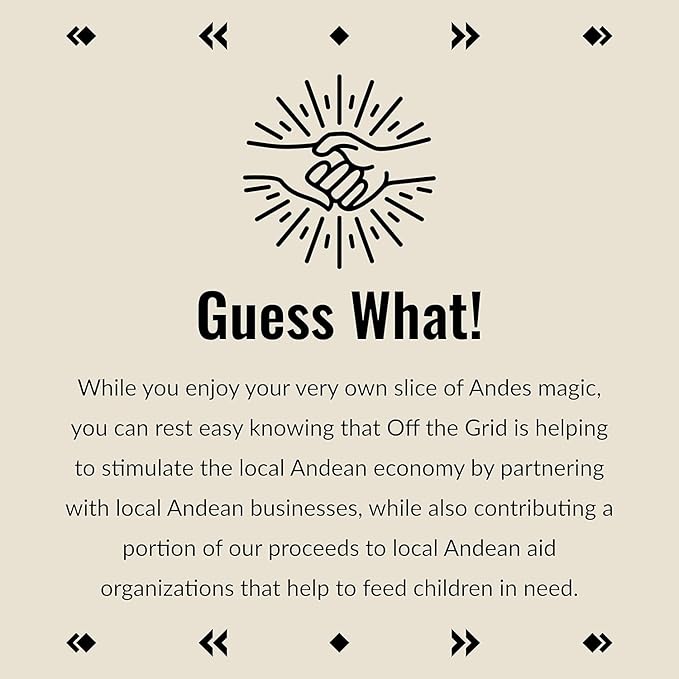 - SOCIALLY RESPONSIBLE: While you enjoy your very own slice of Indian Andes magic, you can rest easy knowing that Off the Grid is helping to stimulate the local Andean economy by partnering with native Andean businesses, while also contributing a portion of our proceeds to local Andean aid organizations that help to feed children in need.