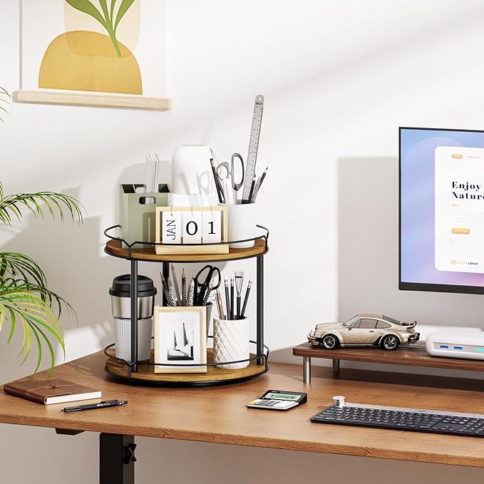 - 1. Stay Organized in Style: Ditch clutter and stay organized with our two-tier turntable Lazy Susan! This beautiful wooden rotating spice rack spinner is perfect for any table top, farmhouse bathroom decor, round decorative tray for your vanity, counter, sink, coffee table, and much more