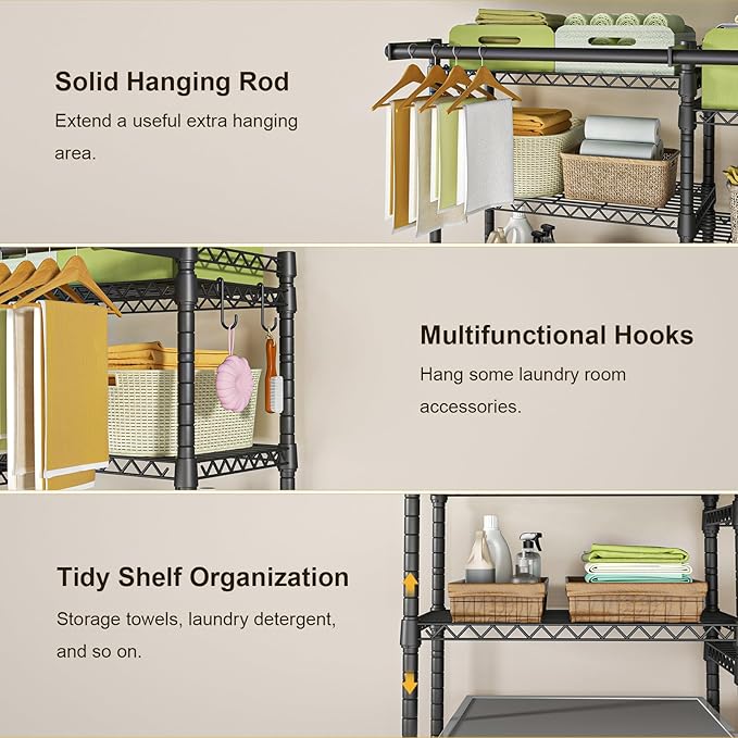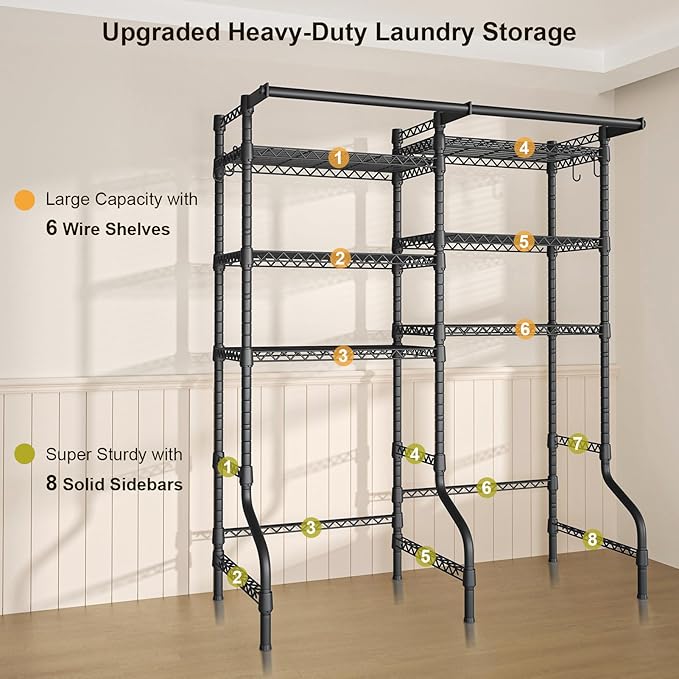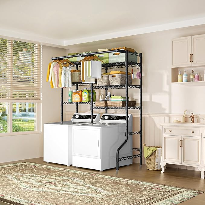 - [Upgraded Design]: 6 wire shelves offer a lot of storage space, and the lower poles adopted the wider bent poles, which can make the laundry room shelves more stable. This practical rack adds additional hanging space with the upper crossbar. The hooks can hang some light clothing, towels, or other laundry room cleaning supplies