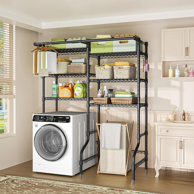 - [Modern & Stylish Design]: 2 rows of racks suit separate washing machines and dryers. It can also be used as over the dryer rack, towel rack, clothes drying rack, toiletries storage shelf for storage in your bathroom