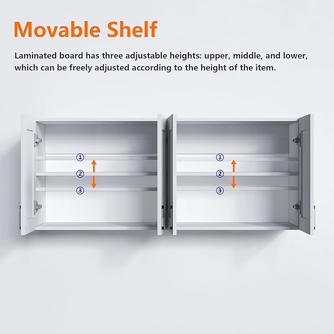 - ▶ Adjustable shelves:Wall cabinet shelves are adjustable in 3 sections, allowing for free height adjustment according to needs, greatly increasing the practicality of the product.