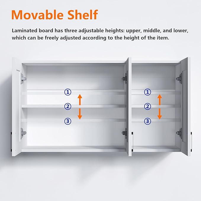 - ▶ Adjustable shelves:Wall cabinet shelves are adjustable in 3 sections, allowing for free height adjustment according to needs, greatly increasing the practicality of the product.