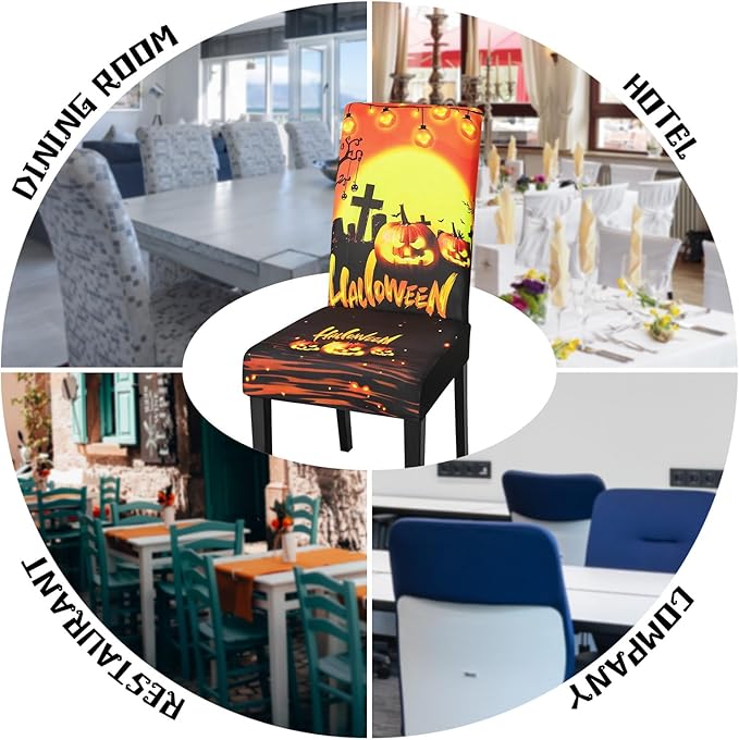 - 【🎃🎃🎃Versatile Halloween Essential】- The Christmas kitchen chair covers fit for most of parsons chair. Christmas dining room chair covers can be used for hotel,wedding banquet, dinner, meeting, celebration, ceremony, family dining room Christmas decoration. Whether you're decorating for a Halloween-themed wedding, a haunted house party, or simply adding some festive touches to your home, our slipcover is a versatile choice.