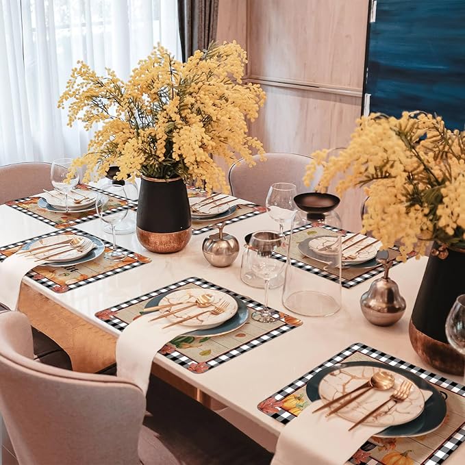 - Eye-Catching design: Buffalo Plaid Placemats helps to create a holiday atmosphere.Featuring charming designs like pumpkins, trucks, leaves, black and white buffalo plaid patterns, and other classic elements, fall pumpkin placemats elevate the aesthetic of your table setting, establishing a warm and welcoming environment for joyful gatherings.