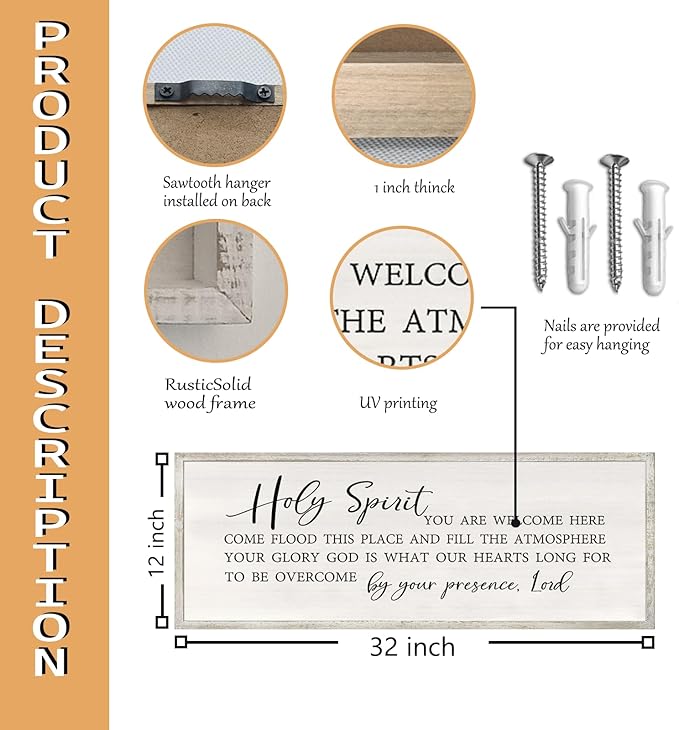 Holy Spirit You are Welcome Here Wall Decor Art 32x12 Inch Large Christian Song Bible Verse Plaque Wood Framed Sign Living Room Scripture Quote Religious For Office Wall Hanging (White)