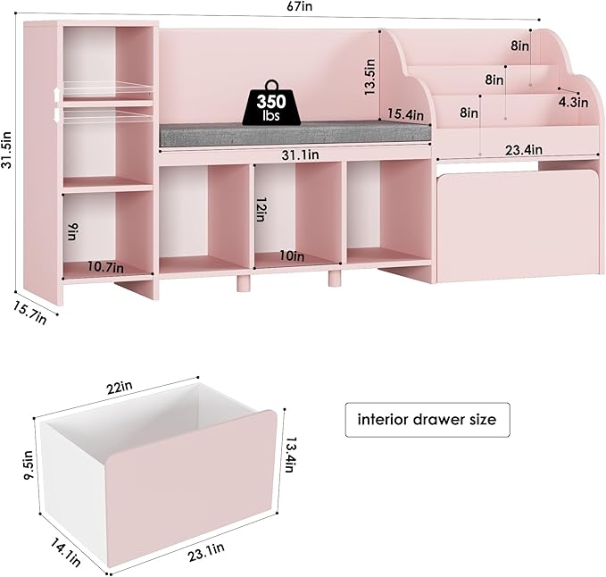 - [4-in-1 Bookshelf] This versatile masterpiece seamlessly integrates storage cubbies, a book rack, a mobile toy box, and a comfortable cushioned seat, forming an organized and joyful play area for your child while offering convenient access to books and toys to keep the space tidy