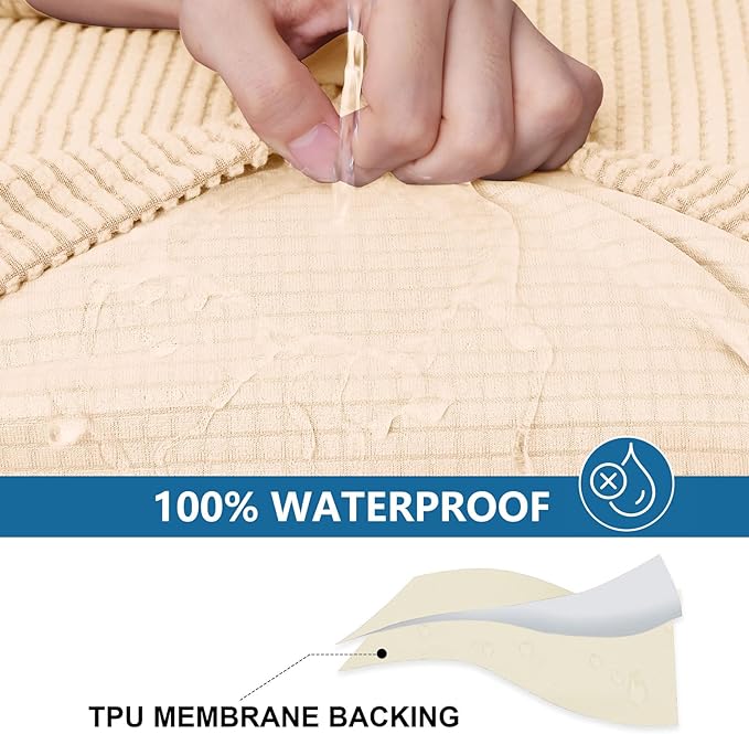 - [100% Waterproof Fabric] The back of the couch seat cover has a waterproof layer made of TPU. Great on against spills, pets' fur, stains, and normal wear and tear or any possible mess and accidents.