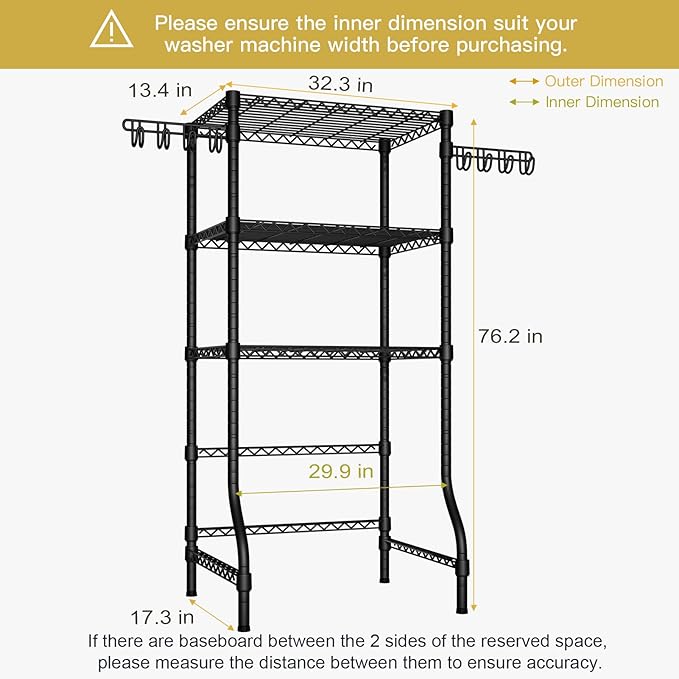 - Overall Dimension: The whole dimension of the laundry room storage organizer is 32.3”W x 17.3”D x 76.2”H. The inner width of the storage rack is 29.9 inches