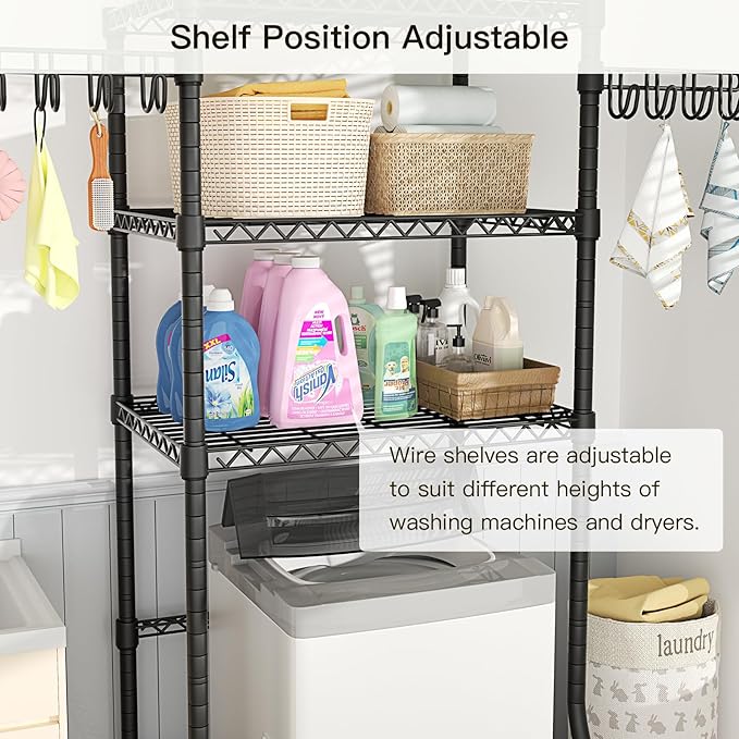 - Space Saver: The adjustable wire shelves for storing and organizing daily laundry room accessories, like towels, washing powder, washing liquid, and laundry beads. It also can be adjusted to any height you want to suit different height washing machines