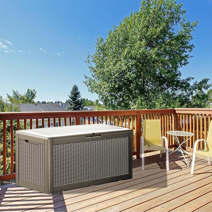 - High-Quality Resin Material:Constructed from the latest high-quality resin, this deck box is waterproof, UV-resistant, anti-fading, and anti-bending, ensuring durability for long-term outdoor use.