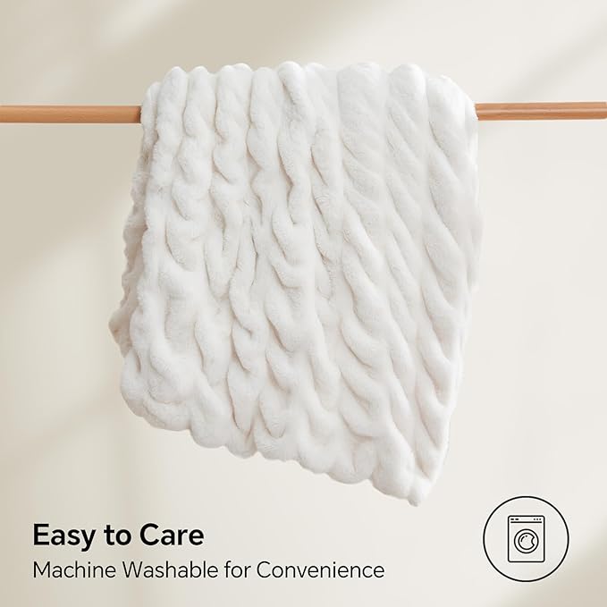 BEDELITE Faux Fur Throw Blanket for Couch, Soft and Cozy Boho Ruched Fluffy Blanket, Warm Plush Fuzzy Faux Rabbit Fur Blanket for Women Gift (Cream, 50"x 60")