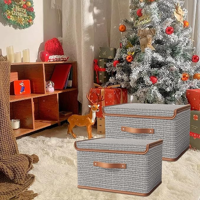 Tuza 2 Pack Storage Bins with Lids, Collapsible Closet Organizer Container, Fabric Organizer Box with Handles, Decorative Storage Boxes with Lids for Organizing Clothes, Blanket, Light Grey, Medium