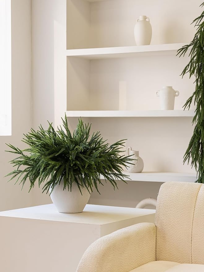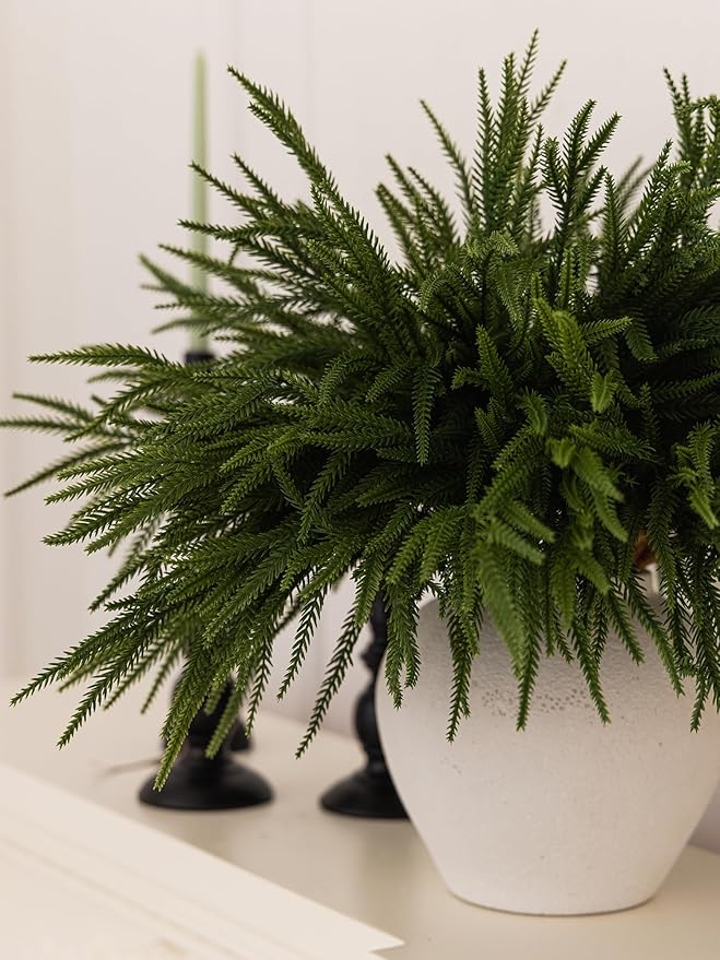- 【Premium Quality and Natural Appearance】Crafted from high-quality PE, these branches mimic the natural green color of real Norfolk Pine, offering both aesthetic beauty and durability. After opening the package, simply let the product air out for a few hours to eliminate any initial odor, ensuring a better experience. Note: Vase not included.