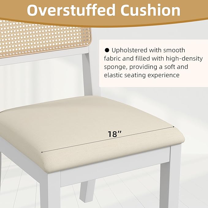 Westice Rattan Dining Chairs Set of 2, Farmhouse Natural Dining Room Chairs with Upholstered Cushion, Wood Armless Chairs for Kitchen/Restaurant, White